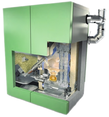 Die Abreinigung des HDG F-Kessels ist eine saubere Sache: durch Ziehen am frontseitig angebrachten Hebel werden die Reinigungsturbulatoren bewegt und damit die Wärmetauscherflächen gereinigt, wodurch eine optimale Wärmeübertragung erreicht wird. Optional kann die Abreinigung auch durch einen Motor über die neue Touch-Steuerung automatisiert werden. Optional ist die HDG Anzündautomatik verfügbar. Dies macht das Holzheizen noch komfortabler, da der Füllschachtinhalt bedarfsgerecht und selbsttätig gezündet wird. Auf Seiten des Pelletmoduls funktioniert die Abreinigung sowie die Ascheaustragung in den externen Aschebehälter standardmäßig komplett automatisch.