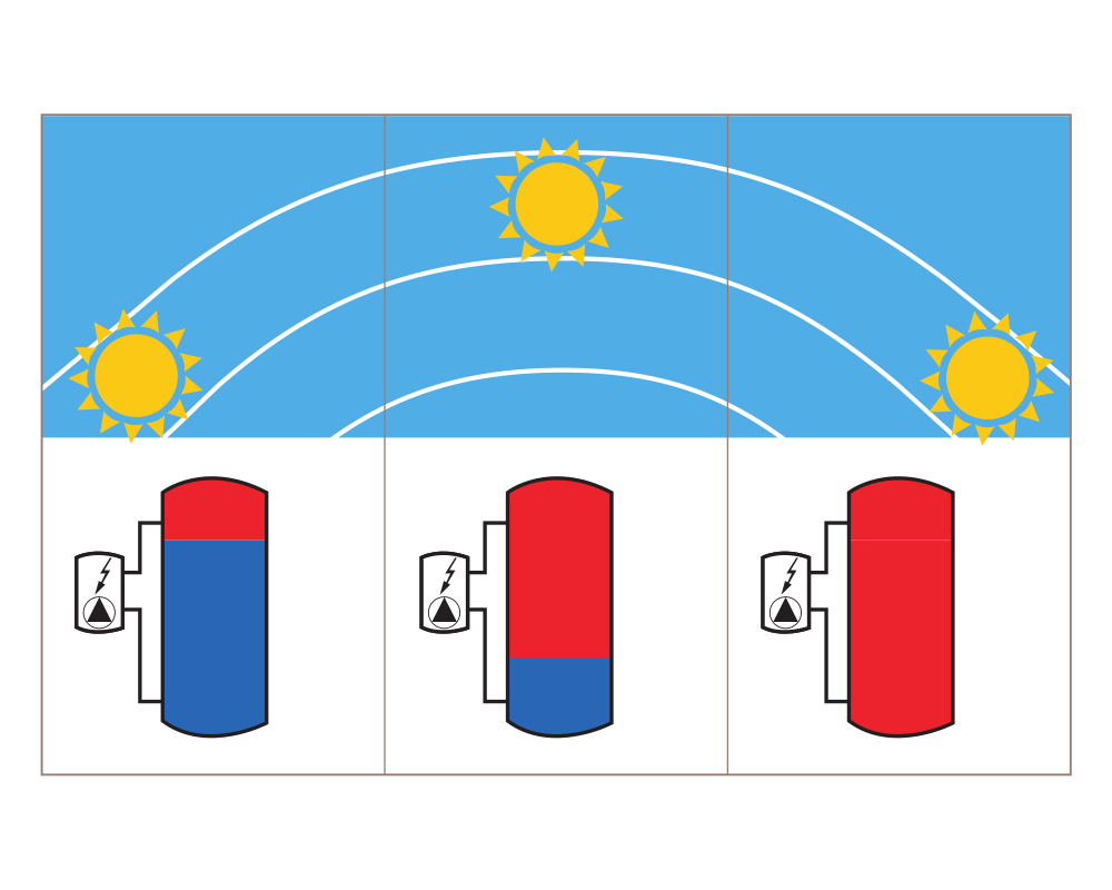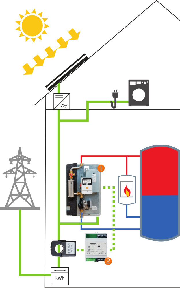 Die Leistungsmodulation sorgt dafür, dass schon kleinste Überschussleistungen von dem System genutzt werden. Außerdem wird über eine Leistungsmessung sicher gestellt, dass kein Netzstrom für Heizzwecke verwendet wird. Selbst geringe und schwankende Überschussleistungen können in nutzbare Wärme mit konstanter Temperatur umgewandelt werden. Damit wird der Speicher geschichtet von oben nach unten beladen und es steht nach kurzer Zeit bereits nutzbare Wärme zu Verfügung und die konventionelle, fossile Nachheizung wird unterdrückt.