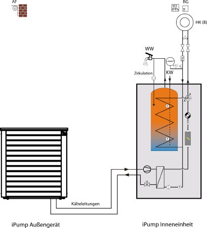 Die iPump A beinhaltet einen Trinkwarmwasserspeicher mit 200 Liter. Mit der integrierten Boost-Funktion ist eine Warmwasserzapfmenge von 432 Liter mit einer Temperatur von 40°C möglich. Dank modernster Invertertechnologie ist eine stufenlose Leistungsanpassung möglich. Der drehzahlgeregelte Verdichter erzeugt daher nur die Energie die benötigt wird. Das farbige 7“ Touchdisplay des NAVIGATOR 2.0 erleichtert die Bedienung der Wärmepumpe. Das Display kann vom Gehäuse der iPump A 3-11 abgenommen und z.B. im Wohnraum angebracht werden. Um die Einbringung in den Heizraum zu erleichtern, ist die iPump A 3-11 teilbar. Die kälteseitigen Verbindungsleitungen zum Außengerät können wahlweise auf der rechten oder linken Seite der Inneneinheit angeschlossen werden. Die Anschlüsse für Heizung und Warmwasser befinden sich oben, ebenso der Anschluss für die LAN-Verbindung. Die iPump A 3-11 entspricht den geltenden EU-Normen und Verordnungen. Die Inneneinheit ist mit dem Sicherheitskältemittel R410A gefüllt und werksseitig auf Funktionsfähigkeit geprüft. Das Außengerät ist mit Stickstoff vorgefüllt. Ab 6 m Leitungslänge zwischen Inneneinheit und Außengerät muss Kältemittel nachgefüllt werden. Die Inneneinheit und das Außengerät können maximal 20 m voneinander entfernt platziert werden. Bis zu einer Leitungslänge von 15 m ist keine jährliche Dichtheitsprüfung erforderlich.