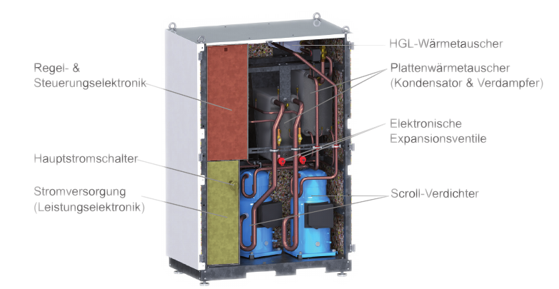 Die Wärmepumpe entspricht den geltenden EU-Normen und Verordnungen, ist mit Kältemittel R410A gefüllt und werkseitig auf Funktions- und Leistungsfähigkeit geprüft. Mit der als Zubehör erhältlichen iDM-Systemkühlung kann günstig gleichzeitig Kühl- und Heizenergie bereitgestellt werden. Bei der Verschaltung von mehreren Wärmepumpen zu einer Kaskade können Heizleistungen von bis zu 1400 kW erreicht werden. Als Standard-Wärmepumpen werden DUO-Einheiten bestehend aus zwei Wärmepumpen inklusive einem hydraulischen Anschlussset angeboten. Zusammen mit der implementierten Kaskaden-Regelung gewährleistet dieses hydraulische Anschlussset einen optimalen Betrieb der Wärmepumpenkaskade.